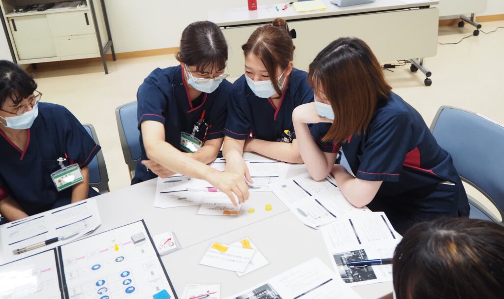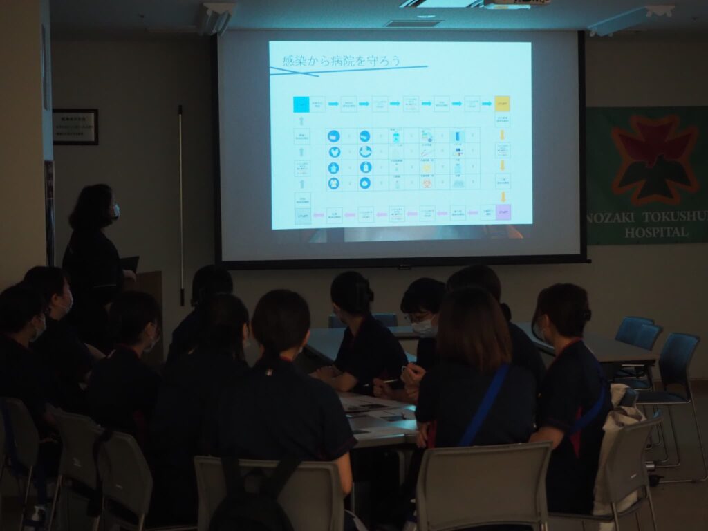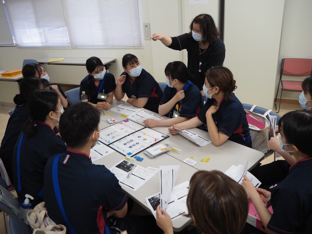 普段皆さんが行っている感染対策が正しく実施できているか、確認しながらゲームを進めていきます。2~3人1組で行うチーム制のため、チーム内で「ガウン要る?」など一緒に考えながら、感染対策の問題を解いていきました。解いていく中で自分が考える感染対策が正しいと分かった時に喜んだり、驚いたり、とても盛り上がりを見せていました。