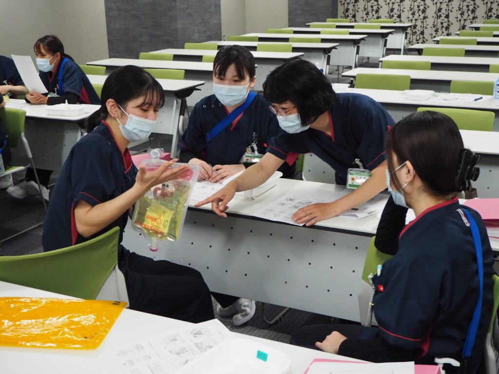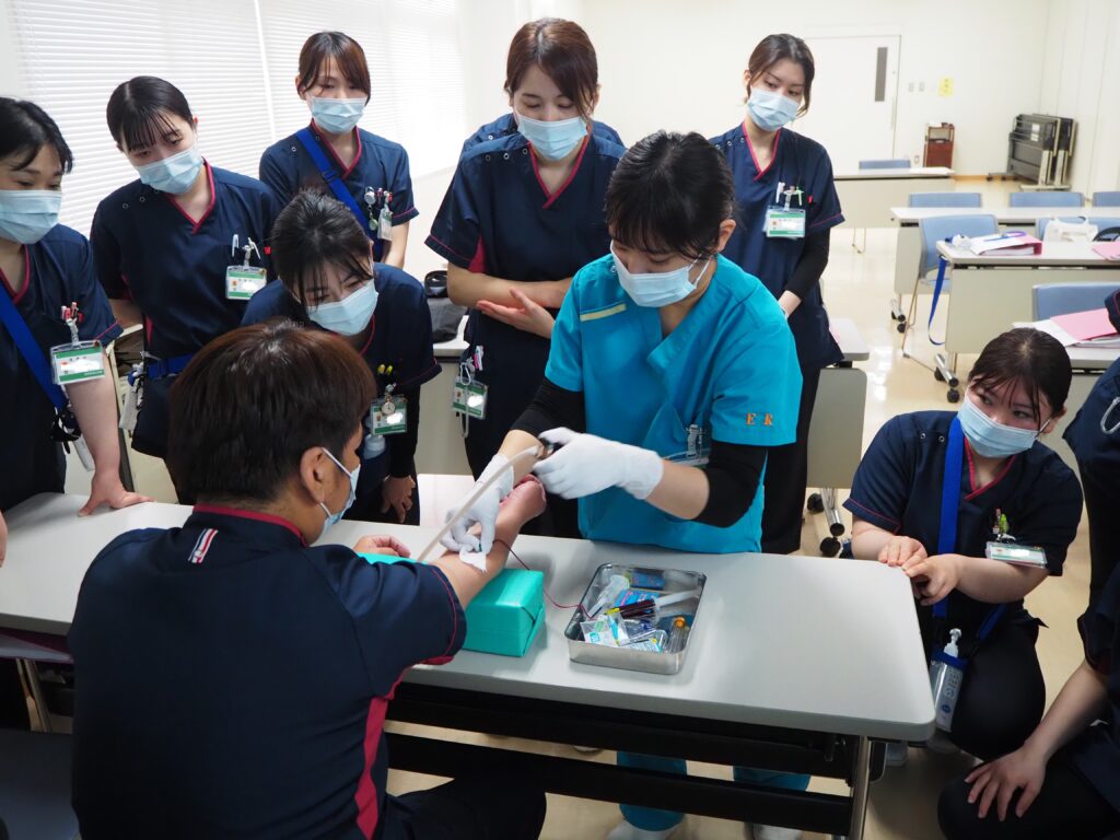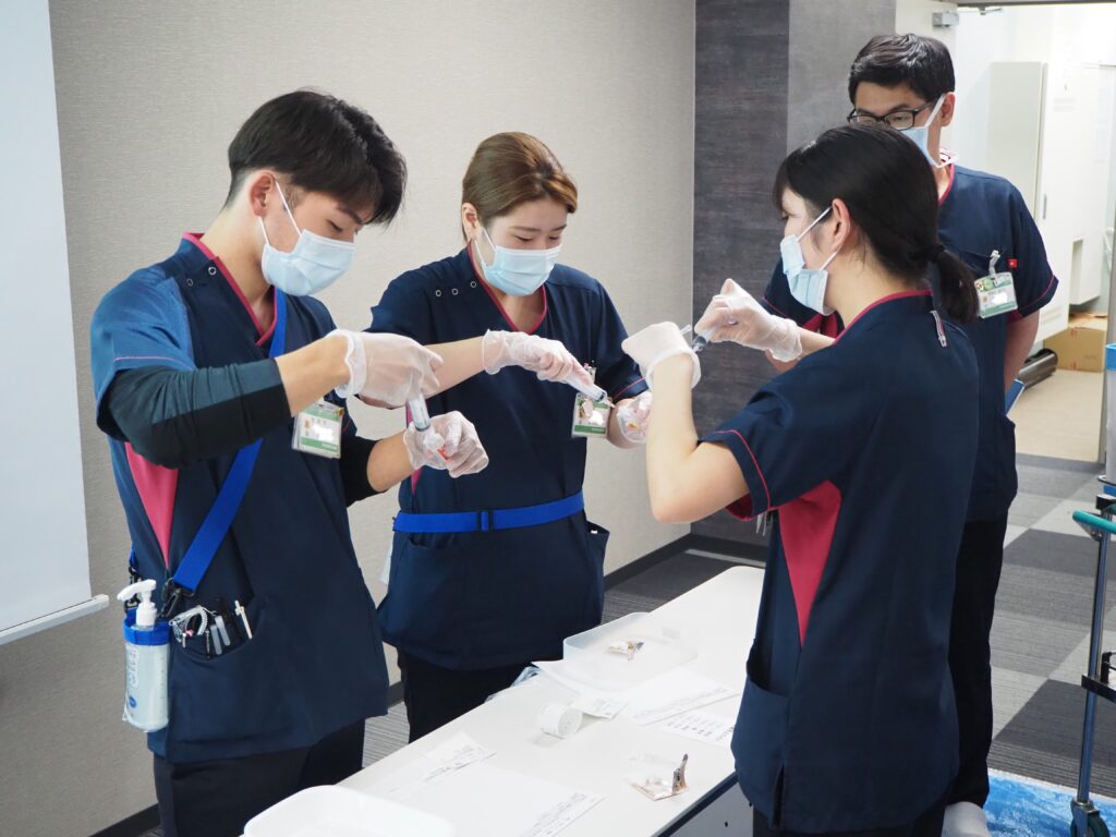 新人同士での採血練習は、最初に採血をする上での準備・手順・注意点を学び、その後実践しました。