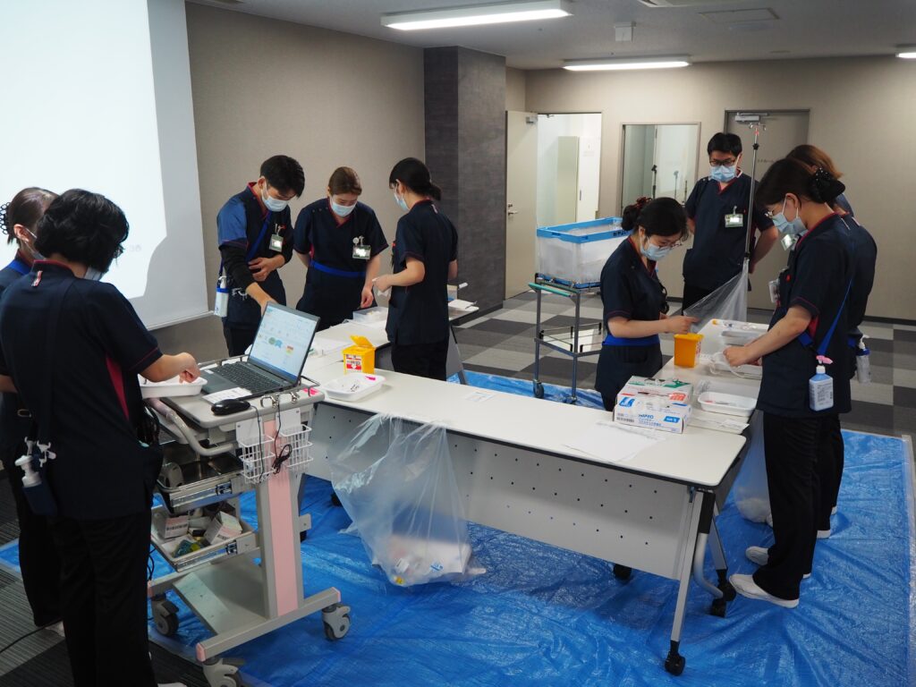 点滴準備、薬剤ミキシングの講義では、アンプルの扱い方や点滴準備、三方活栓や薬剤ミキシングについて、電子カルテを使っての実際の操作を、実際に薬剤や準備をすることによって、学びを深めました。
